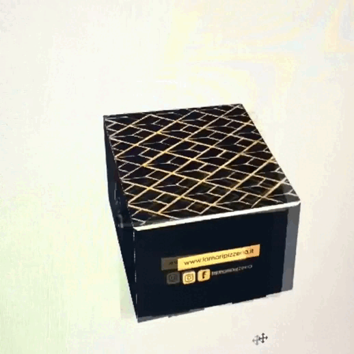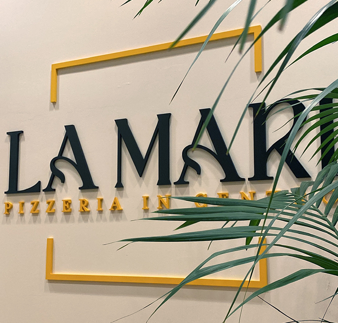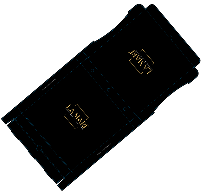 Abbiamo scelto di differenziarci per l’eleganza, il design dei packaging dei cartoni da pizza e dell’asporto della pizzeria La Marì: uno sfondo nero accoglie scritte dorate, creando un contrasto lussuoso e raffinato.