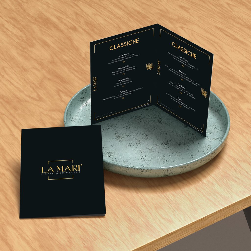 Abbiamo voluto distinguere il menù della pizzeria La Marì per la sua progettazione grafica sofisticata: una base scura offre un’elegante cornice alle scritte bianche, creando un contrasto accattivante e una leggibilità nitida che guida gli ospiti attraverso un viaggio culinario.